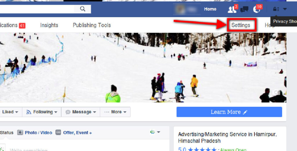 Step 2: Click on "Setting" to the top right corner of your Facebook page as shown.
